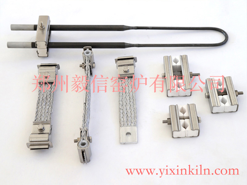 硅钼棒夹具,主要分为3/6硅钼棒夹具,4/9硅钼棒夹具,6/12硅钼棒夹具,9/18硅钼棒夹具,12/24硅钼棒夹具等。主要由不锈钢和编织带组成,或者铝箔连接带。在使用中各有各的优势,铝箔连接带接触面大,厚实,在9/18硅钼棒用使用比较多,铝丝编织带主要用于6/12小实验炉,硅钼棒实验炉因高温时间短,炉顶一般不用太厚,硅钼棒自身传热比较高,用铝丝编织带会加快散热。硅钼棒夹块一般分为25中间距到70中间距左右。硅钼棒连接带有长有短,我们可以根据用户需求定制加长连接带,常规为180长,有特定需求欢迎来电咨询。