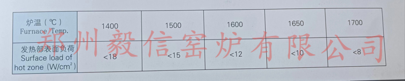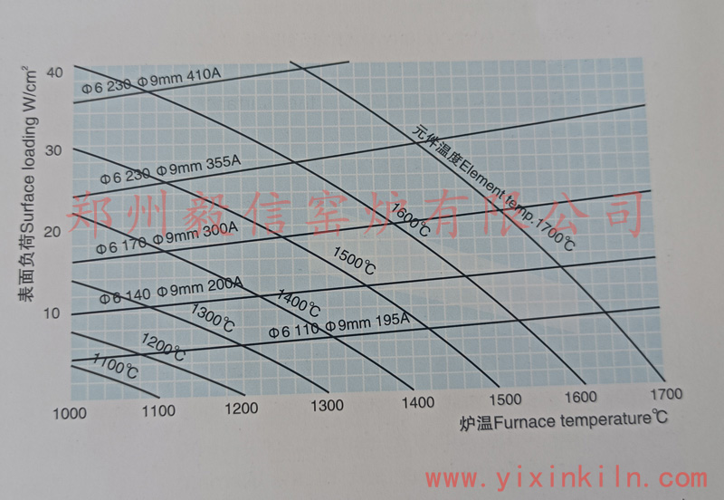 根据炉子的结构、气氛和温度正确的选择元件的表面负荷是达到较长元件寿命的关键。下图示出了硅钼棒元件辐射在不受阻碍情况下的炉温、元件温度与表面负荷间的关系,阴影部分为常用的表面负荷-温度范围