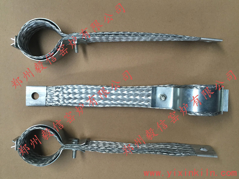 单环硅碳棒编织带夹具,夹头有不锈钢的和镀锌铁的,不锈钢的夹持性更好,一般用于直径30以上的硅碳棒。