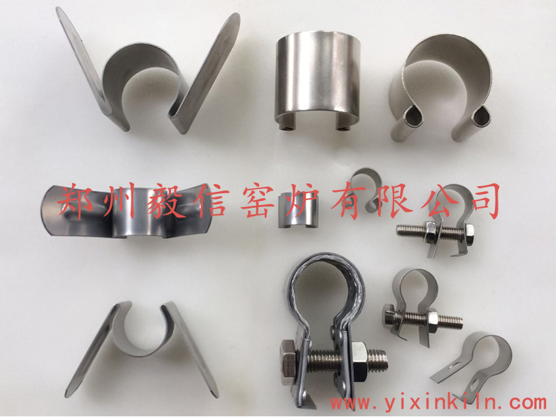 郑州毅信窑炉有限公司硅碳棒夹具齐全,有不锈钢蝴蝶夹(M夹)、C型夹、、G型夹、内编织G型夹,铝编织带,铝箔带,陶瓷固定夹块,常用规格大量现货供应,一般当天或隔天发货。编织带、铝箔带可定做。大批量订单加工时间可协商,欢迎来电。蝴蝶夹/M夹因使用方便快捷,应用相当广泛。在元件冷端喷铝处,缠绕一圈铝箔带或编织带,然后捏开蝴蝶夹卡上即可。