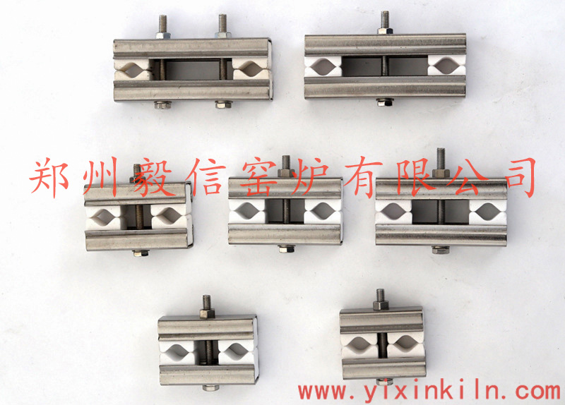 固定夹块托架有不锈钢材质和镀锌材质的;用于两冷端圆心距25.30.35.40.45.50.55.60等的硅碳棒,硅钼棒加热元件,整个元件的重量都是由它承担,元件的位置也由它决定,须仔细安装,使元件垂直悬挂。为避免局部过热,硅钼棒元件下端圆锥部分一定要伸到炉膛内。为避免幅射热传到夹头,夹头下端和穿砖上面的距离不应小于50mm。